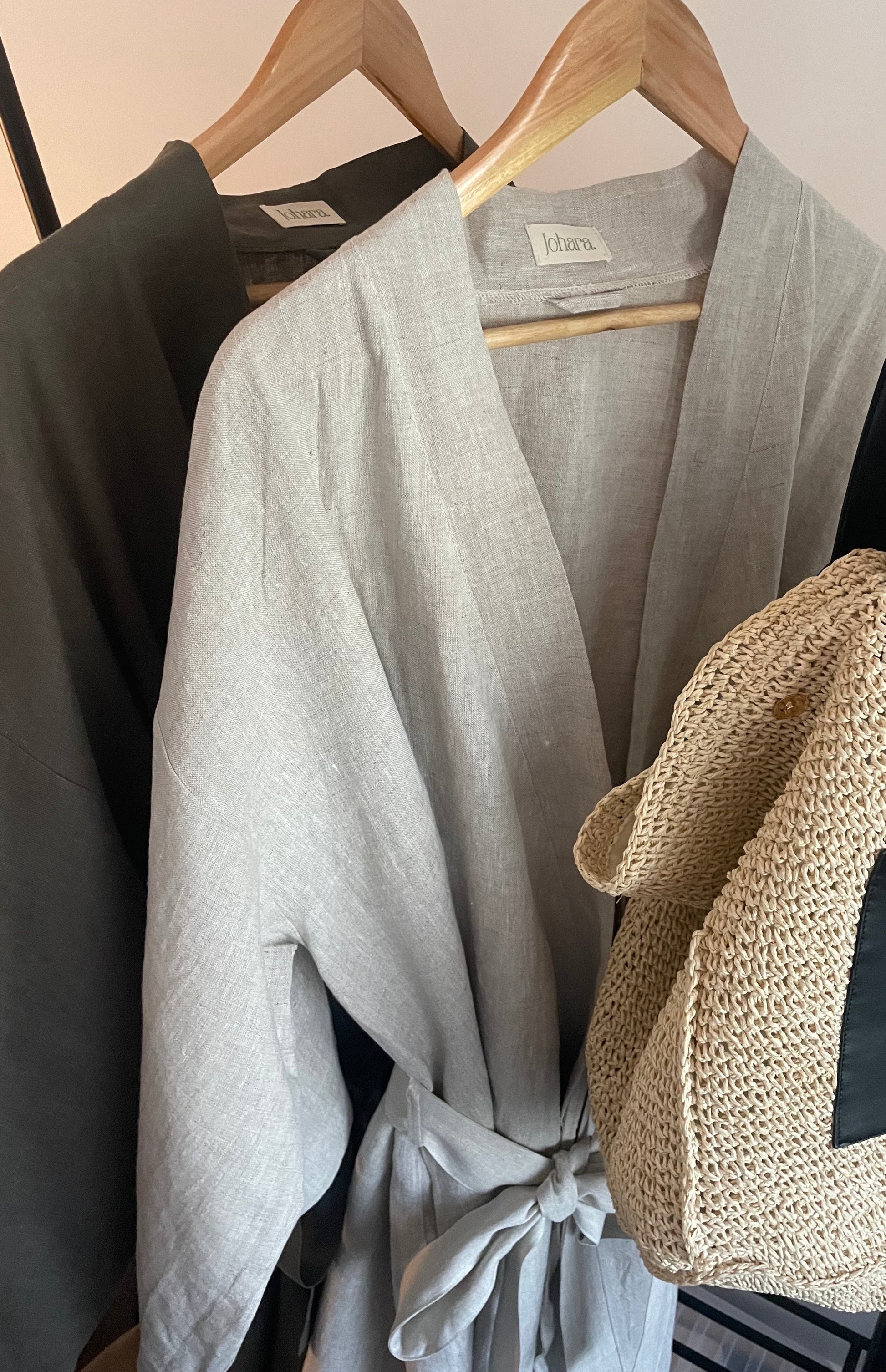 100% Linen. This unisex robe is full length featuring an inside tie for additional coverage plus pockets!